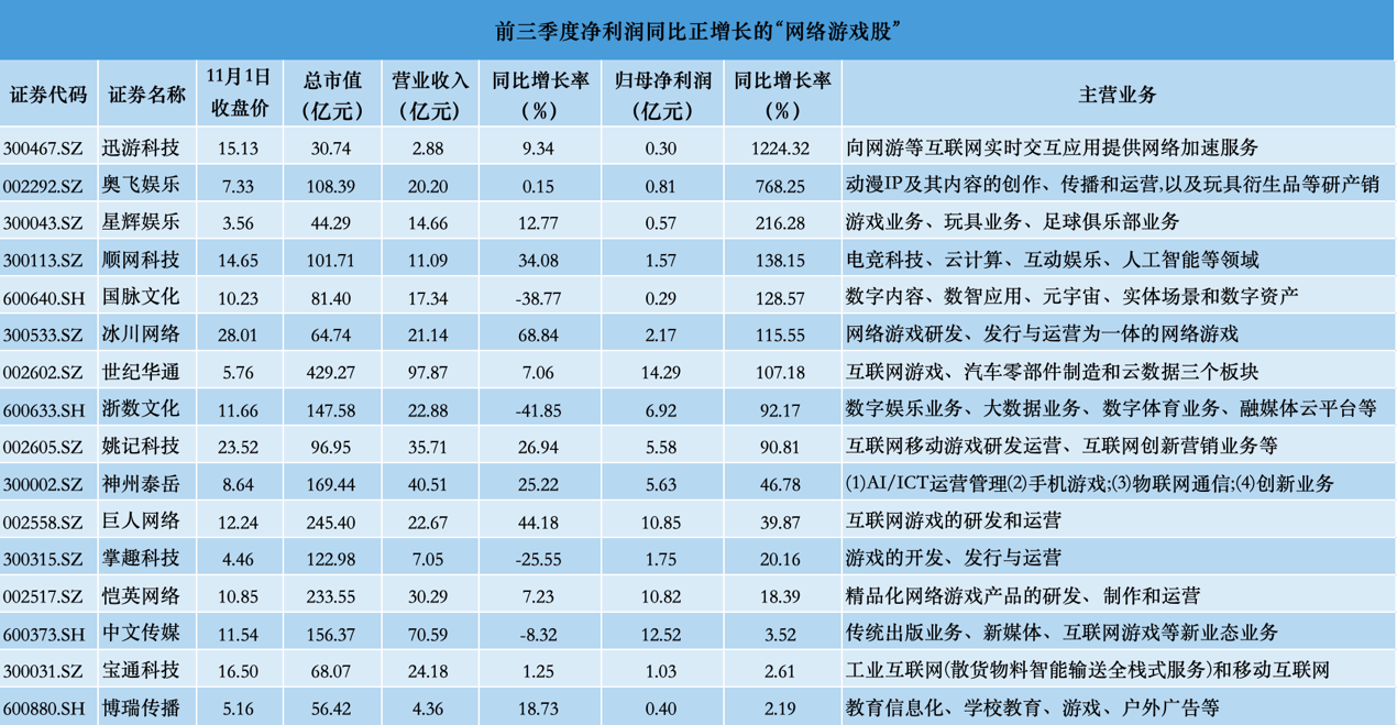 綜合來(lái)看,冰川網(wǎng)絡(luò)、巨人網(wǎng)絡(luò)、順網(wǎng)科技(300113.SZ)、姚記科技(002605.SZ)、神州泰岳(300002.SZ)等公司前三季度營(yíng)收取得較大增長(zhǎng),同比增長(zhǎng)均超20%。