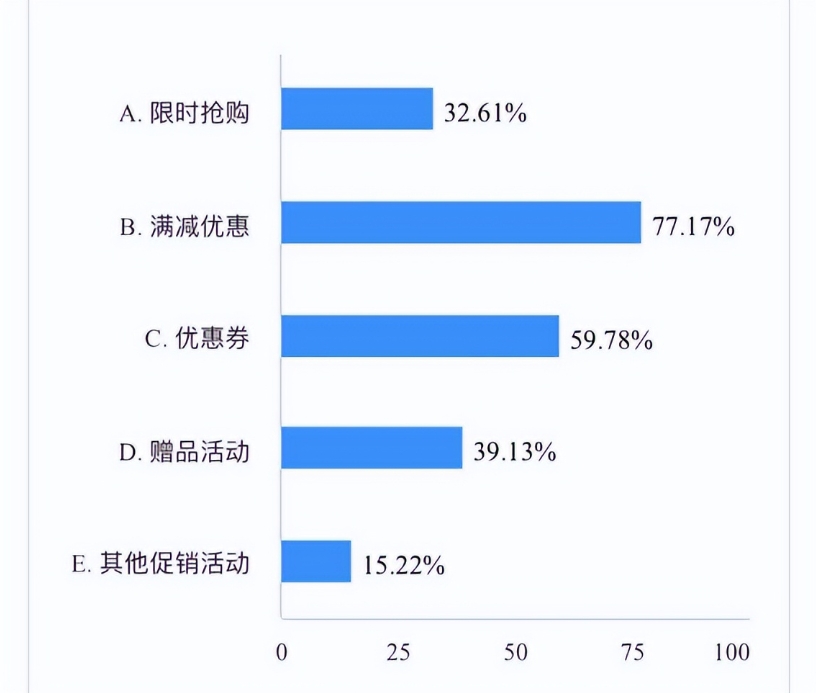 調(diào)查顯示,77.17%的受訪者是因?yàn)椤皾M減優(yōu)惠”在電商平臺(tái)下單,59.78%的受訪者是因?yàn)椤皟?yōu)惠券”,39.13%的受訪者是因?yàn)椤百?zèng)品活動(dòng)”,32.61%的受訪者是因?yàn)椤跋迺r(shí)搶購”,15.22%的受訪者是因?yàn)椤捌渌黉N活動(dòng)”。