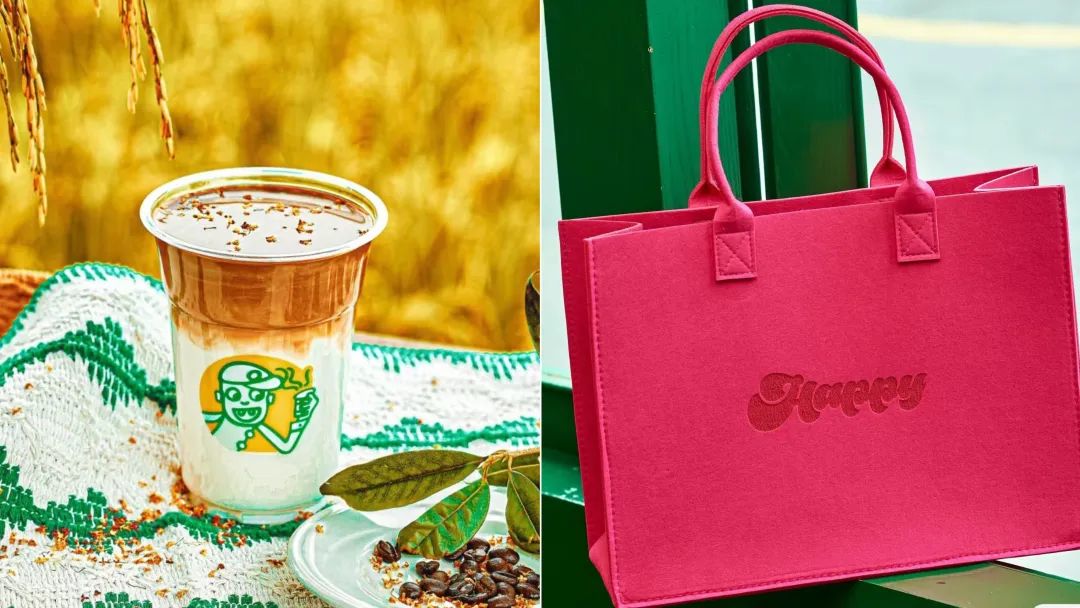 讓我印象深刻的是,搞怪的品牌IP和自帶情緒力的品牌名,其產(chǎn)品名也都圍繞“快樂”設(shè)置,比如“真開心拿鐵”,周邊包袋套餐則是“包你開心”。