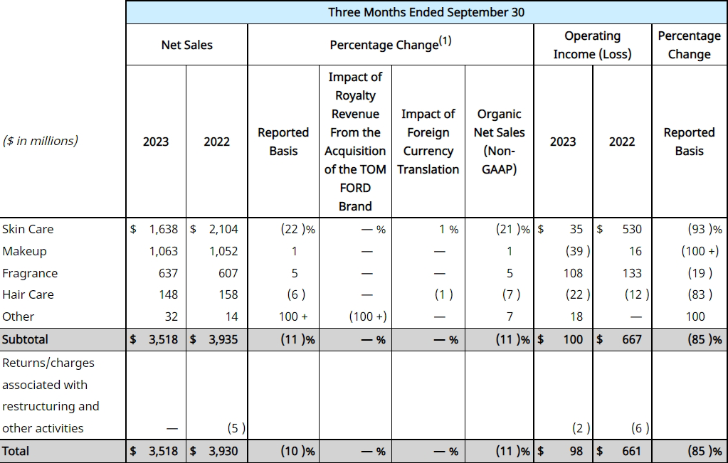 分部門來看,營收占比最大的護膚出現(xiàn)下滑,香水和彩妝業(yè)務(wù)的有機凈銷售額增長,部分抵消了護膚品的下降。