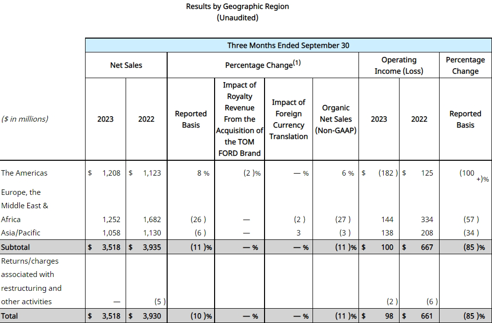 受中國市場整體高端美妝復(fù)蘇速度慢于預(yù)期的影響,亞太區(qū)有機凈銷售額下降3%。在中國內(nèi)地市場,由于護膚品牌銷售低迷的緣故,凈銷售額有所下降。這一下降部分被香氛業(yè)務(wù)的增長所抵消,香氛業(yè)務(wù)的增長主要是由2023財年第四季度Le Labo的推出推動的。