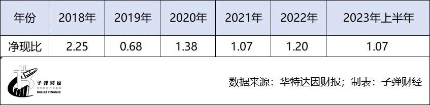 值得注意的是,除2019年外,華特達因的凈現(xiàn)比(經營活動發(fā)生的現(xiàn)金流凈額除以凈利潤的比例)均大于1,這說明了華特達因當期的凈利潤有足夠的現(xiàn)金保障,并不是紙面富貴。