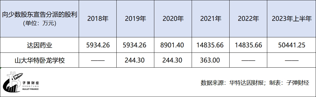 據統(tǒng)計,2018年—2023年上半年,公司向達因藥業(yè)少數股東分配的股利為10.09億元,支付給山大華特臥龍學校少數股東的股利為851.6萬元,少數股東分紅總額遠高于公司向上市公司股東分紅總額5.97億元。