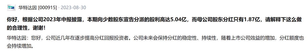 這一回答顯然并不能讓投資人滿意。不差錢的華特達因為何給少數股東的分紅,遠遠高于上市公司股東?這還需要公司的進一步解釋。