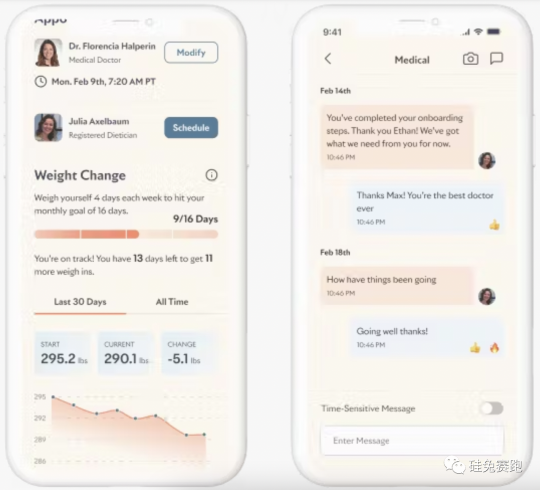 還有像是通過專注于代謝健康幫助減肥的平臺Calibrate提供用戶與醫(yī)生間一對一的指導(dǎo),雖然也會為用戶開減肥藥,但更注重在飲食、鍛煉、睡眠和情緒等多個(gè)方面提供計(jì)劃和建議,通過全套生活方式指導(dǎo)進(jìn)行長期體重管理,目前平臺上的用戶大多為45歲以上的女性,數(shù)據(jù)顯示其會員在Calibrate的幫助下每年能夠平均減重14%。Calibrate在過去三年內(nèi)完成了1.27億美元融資,F(xiàn)ounders Fund和Tiger Global Management在2021年領(lǐng)投的1億美元B輪讓其估值直接達(dá)到了3.65億美元。