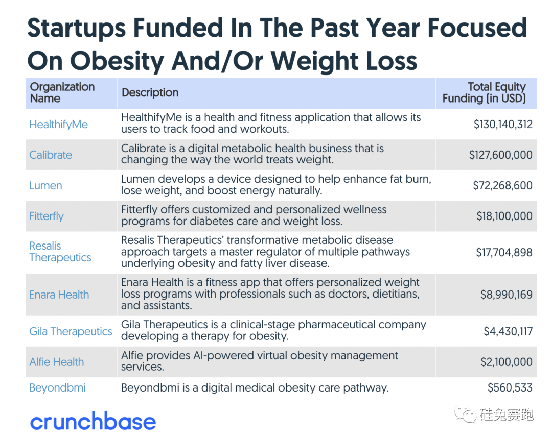 據(jù)Crunchbase數(shù)據(jù)顯示,去年全球減重和肥胖管理類公司的融資總額就達(dá)到了快4億美元,包括將用戶與營養(yǎng)類醫(yī)師相聯(lián)結(jié)的數(shù)字平臺、讓用戶記錄和監(jiān)測飲食和運(yùn)動的app、治療肥胖靶向藥的開發(fā)商、還有可幫助燃脂和增加精力的智能設(shè)備等等