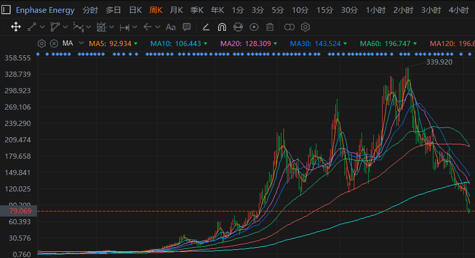 昱能科技其實(shí)并不是微逆故事的原創(chuàng),納斯達(dá)克的EnphaseEnergy才是正宗,也是昱能科技等公司的對(duì)標(biāo)公司。2019年初,ENPH的股價(jià)在5美元附近啟動(dòng),在2021年和2022年不斷創(chuàng)出新高,一度沖到近340元,漲幅70倍,今年以來一路回撤到80美元以下。