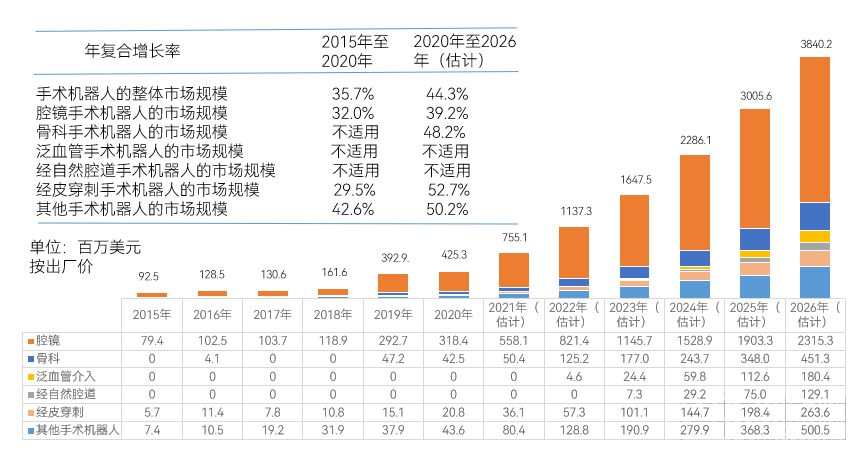 據(jù)沙利文數(shù)據(jù)披露,2020年,國內(nèi)手術(shù)機器人市場規(guī)模達到4.3億美元,復(fù)合增速為35.7%;估計到2026年達到38.4億美元,全球2020-2026年復(fù)合增速預(yù)計為26.2%,國內(nèi)為44.3%,超過全球18.1%,國內(nèi)市場潛力巨大。其中,預(yù)計到2026年,腔鏡手術(shù)機器人市場規(guī)模將達23.2億美元,骨科手術(shù)機器人將達4.5億美元。具體如下: