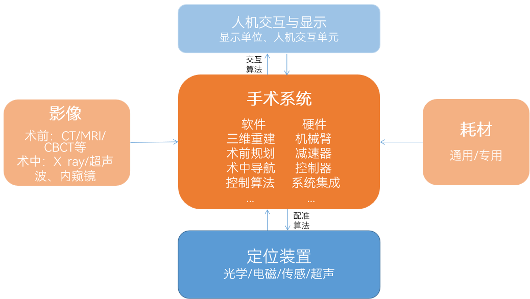 手術(shù)機器人具有多學(xué)科融合、技術(shù)壁壘高的特點。整體來看,手術(shù)機器人的功能模塊分布如下: