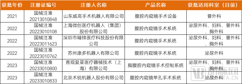 目前國內(nèi)獲NMPA批準(境內(nèi))的腔鏡手術(shù)機器人共6家,整體獲批在數(shù)量上實現(xiàn)逐年突破。