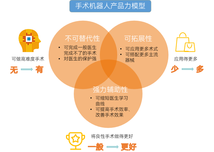 在應(yīng)用上,產(chǎn)品力即手術(shù)機器人實現(xiàn)核心價值是根本。我們認為,手術(shù)機器人的產(chǎn)品力主要包括三個方面:不可替代性、強力輔助性、可拓展性。