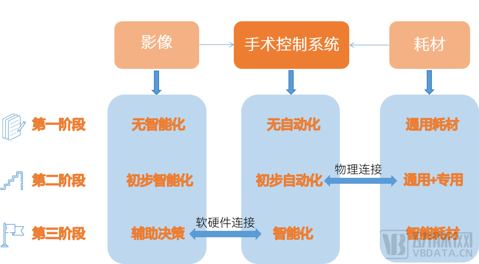 目前這個階段更多是操作類復(fù)現(xiàn),影像沒有實現(xiàn)智能化,耗材也是通用耗材;第二階段,影像引導(dǎo)定位,初步實現(xiàn)智能化,耗材有通用和專用,而耗材和手術(shù)系統(tǒng)的連接是物理連接;到第三個階段,圖像更加智能化,和手術(shù)系統(tǒng)可實現(xiàn)軟硬件連接,并且有智能耗材應(yīng)用,如傳感器、芯片等,當(dāng)然,這個過程可能比較久遠。