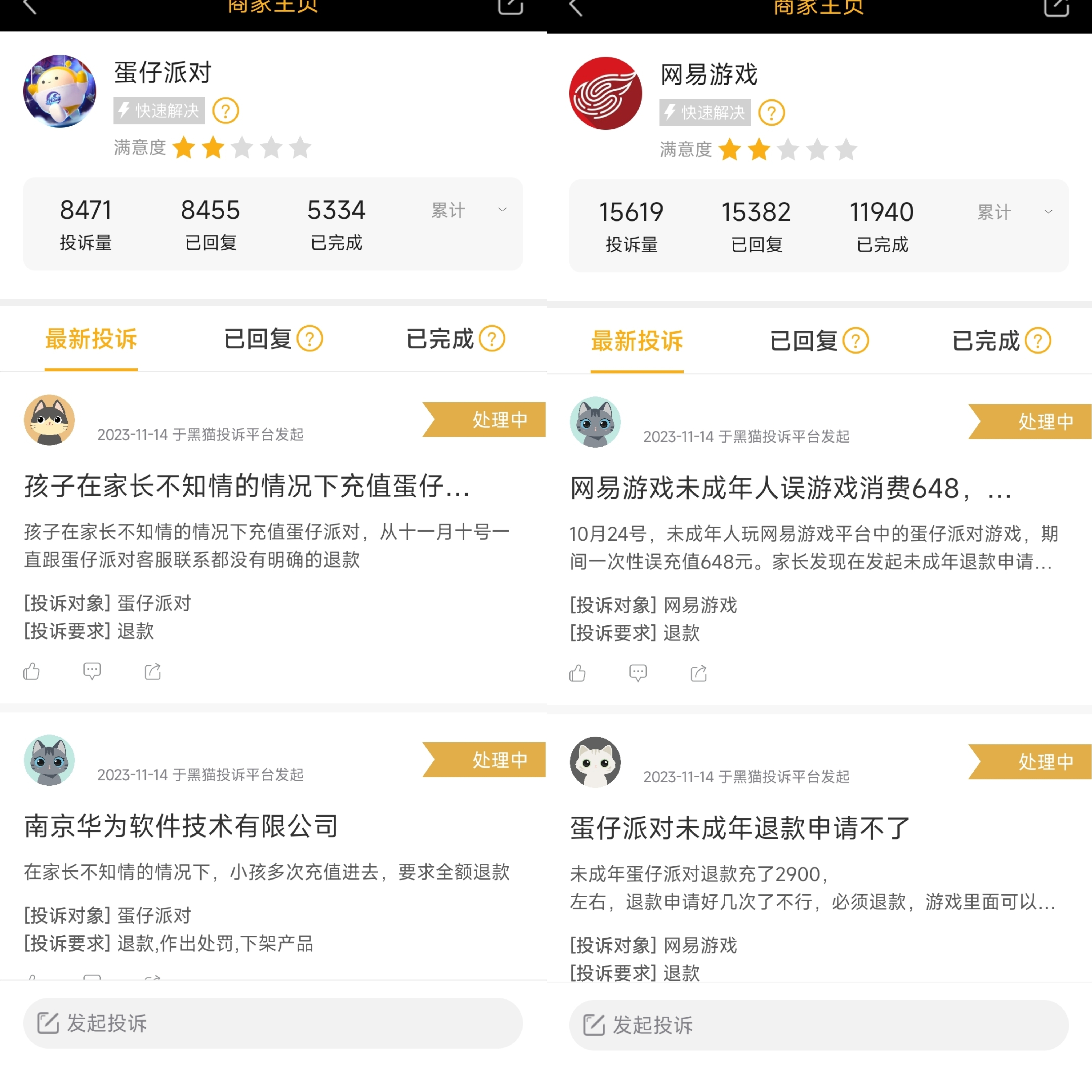 潘哥發(fā)現(xiàn),在黑貓投訴上,網(wǎng)易游戲、蛋仔派對兩個(gè)欄目,累計(jì)收到近2.5萬條投訴,其中絕大多數(shù)內(nèi)容,是《蛋仔派對》未成年人充值問題。