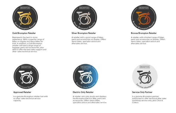 在官網(wǎng),根據(jù)產(chǎn)品和服務(wù)的豐富度,Brompton 把零售商分為 Golden、Sliver、Bronze、Approved、Electric Only、Service Only 六大類。