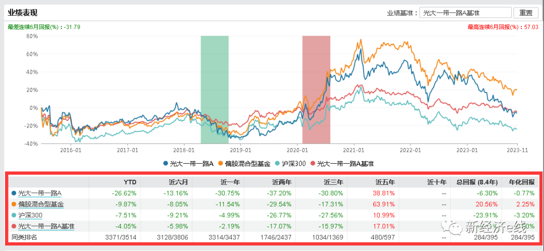 截至2023年11月20日,光大一帶一路A份額最近一年凈值增長率為-30.77%,其業(yè)績比較基準(zhǔn)——滬深300指數(shù)*70%+中證全債指數(shù)*30%為-2.84%。該基金成立于2015年6月26日,但基金最新單位凈值仍在面值以下,僅錄得0.9370元。在長達(dá)8年多的時(shí)間里,基金總回報(bào)仍然虧損,為-6.30%。