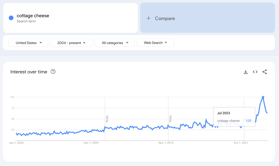 數(shù)據(jù)顯示,今年7月,Google上搜索“農(nóng)家奶酪“的搜索指數(shù)達(dá)到了100,這是2004年以來農(nóng)家奶酪搜索量的最高水平。