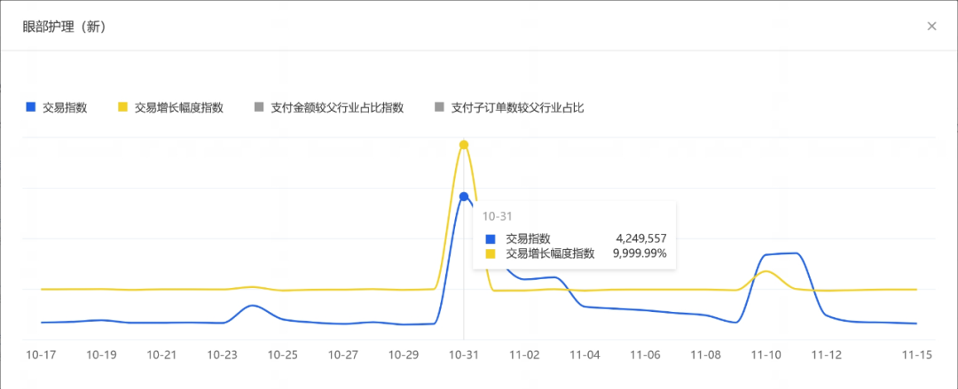 通過分析各品類在過去一個月的交易增長趨勢可發(fā)現,10月31日,也就是天貓雙11預售期結束的當日,交易達到了最高峰,并超過雙11當日的熱度。如眼部護理和面部精華的交易指數分別達到了425萬、1453萬,增長幅度指數均超過了9999.99%。