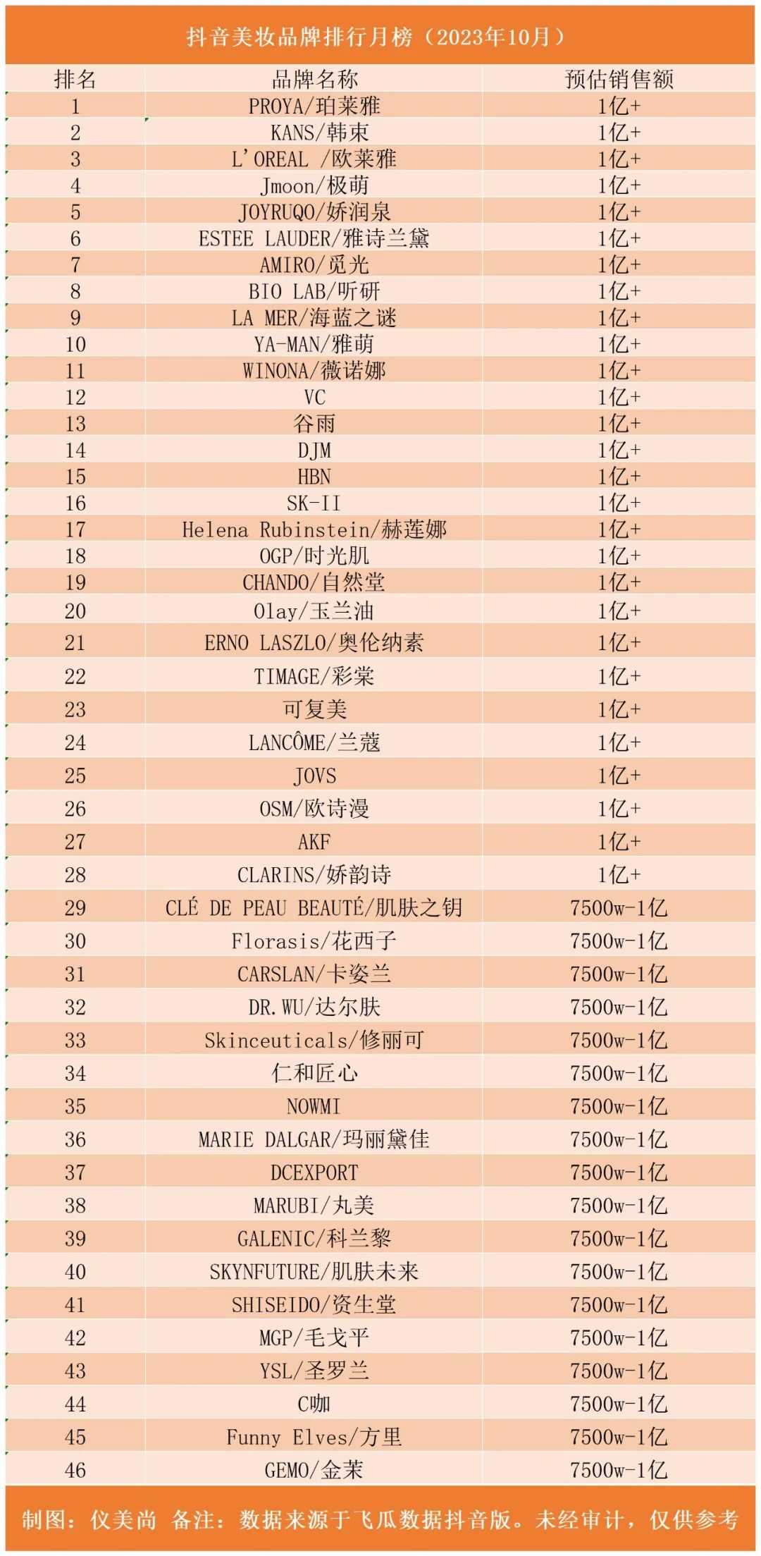 從品牌來看,10月,共有46個品牌的預估最高銷售額達到1億元,環(huán)比9月份的18個增長了256%。其中,國貨品牌高達31個,占比超67%。