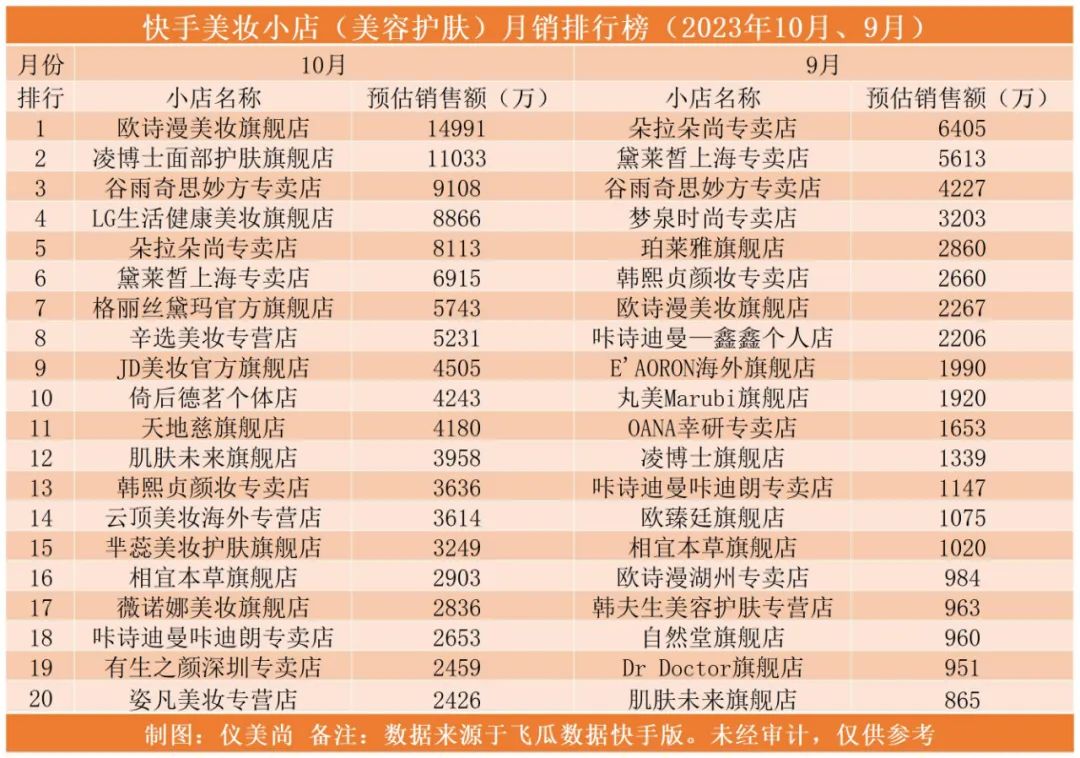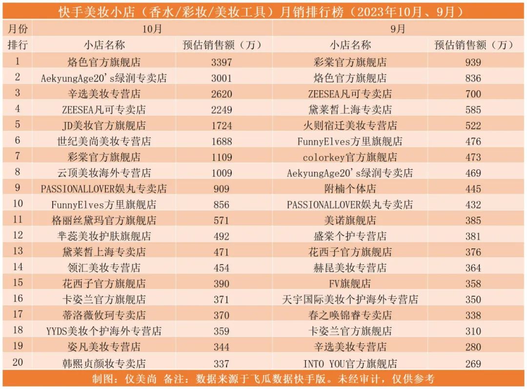 此外,飛瓜快手版數據顯示,快手美妝類目(彩妝/香水/工具)下,TOP500小店的預估銷售額為4.57億,相較9月份的2.87億,環(huán)比增長59%。其中,TOP20小店的預估銷售額為2.27億,相較9月份的0.93億元,環(huán)比增長144%。