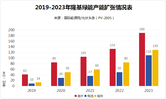 以隆基綠能為例,2019年其產(chǎn)能為42GW硅片,10GW電池、14GW組件。2023年計(jì)劃產(chǎn)能為硅片190GW、電池110GW、組件130GW,分別增長3.52倍、10倍以及8.29倍。
