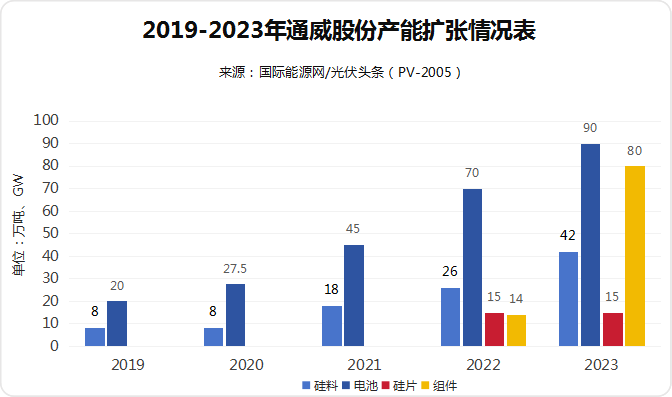 另一大巨頭,通威股份的產(chǎn)能擴(kuò)張同樣激進(jìn)。與2019年相比,其硅料產(chǎn)能增長4.25倍,電池產(chǎn)能增長3.5倍。此外還新增了15GW硅片以及80GW組件產(chǎn)能。