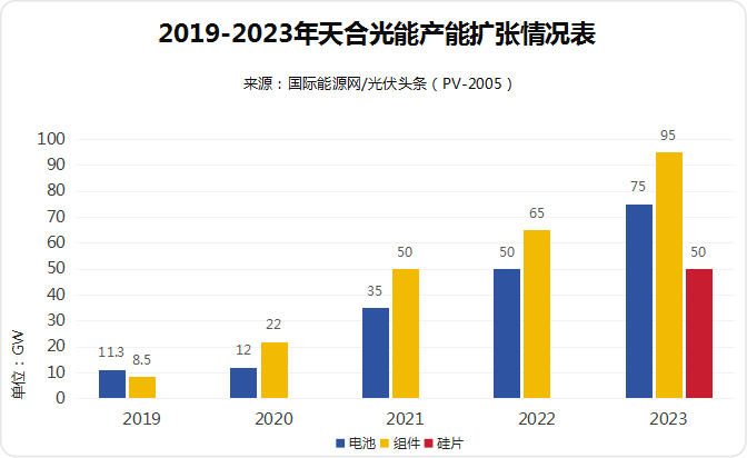 晶科能源2023年計(jì)劃產(chǎn)能為硅片、電池75GW,組件90GW,相比2019年分別增長4.5倍、6.08倍、4.63倍。