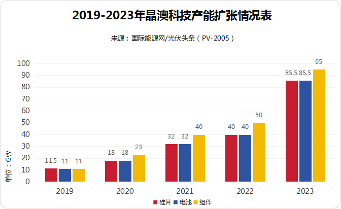 根據(jù)晶澳科技最新公布消息,2023年底,其組件產(chǎn)能將達(dá)到95GW,硅片、電池匹配產(chǎn)能為90%,約為85.5GW。其2019年產(chǎn)能為硅片11.5GW,電池11GW、組件11GW。硅片、電池、組件產(chǎn)能分別增長6.43倍、6.77倍以及7.64倍。