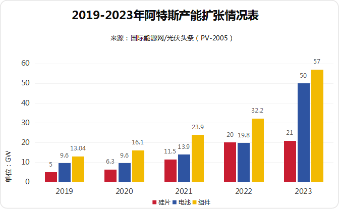 2023年阿特斯產(chǎn)能目標(biāo)為硅片21GW,電池50GW、組件57GW,其2019年產(chǎn)能為硅片5GW、電池9.6GW,組件13.04GW。與2019年相比產(chǎn)能增幅分別為硅片3.2倍,電池4.21倍,組件3.37倍。