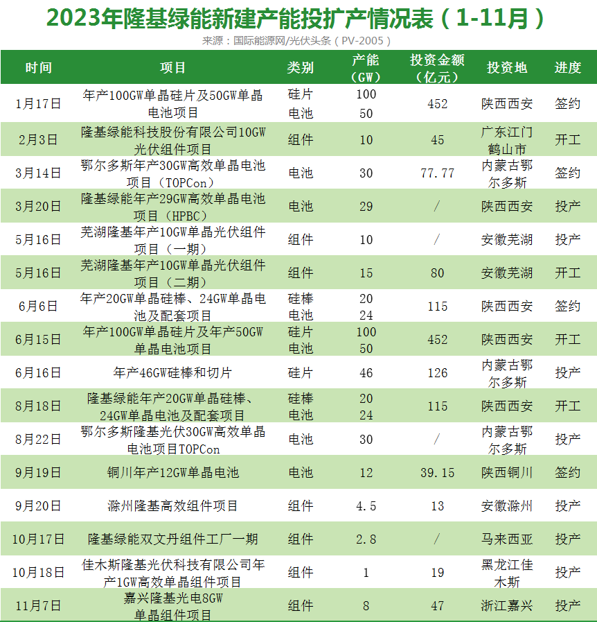 以隆基綠能為例,2023年1月至今,新簽約項(xiàng)目4個(gè),涉及投資683.92億元;開工項(xiàng)目11個(gè),涉及硅棒20GW、硅片100GW、電池74GW,組件25GW;投產(chǎn)項(xiàng)目8個(gè),新增產(chǎn)能硅片46GW、電池59GW、組件26.3GW。