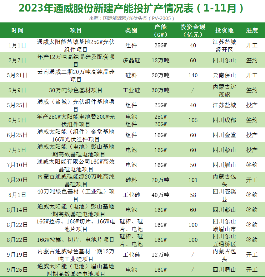 通威股份2023年1月至今,新簽約項(xiàng)目8個(gè),涉及投資533億元;開工項(xiàng)目5個(gè),涉及硅料40萬噸、電池16GW、組件25GW;投產(chǎn)項(xiàng)目3個(gè),新增產(chǎn)能電池16GW、組件41GW。