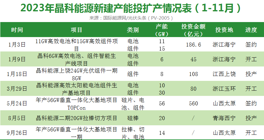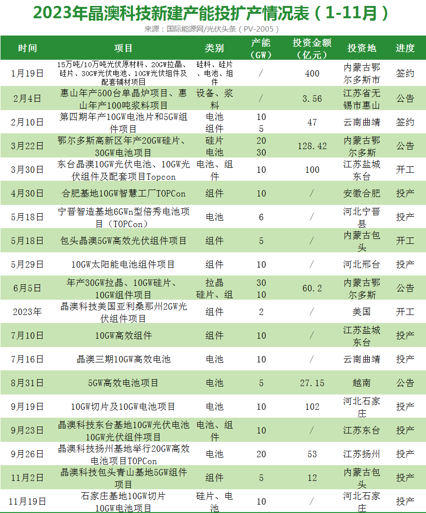 晶澳科技2023年1月至今,新簽約項(xiàng)目9個(gè),涉及投資666.33億元;開工項(xiàng)目3個(gè),涉及電池10GW、組件17GW;投產(chǎn)項(xiàng)目10個(gè),新增產(chǎn)能硅片10GW、電池66GW、組件45GW。