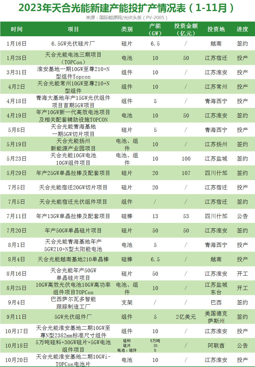 天合光能2023年1月至今,新簽約項(xiàng)目13個(gè),涉及投資374.29億元;開工項(xiàng)目2個(gè),涉及硅片50GW、電池組件10GW;投產(chǎn)項(xiàng)目10個(gè),新增產(chǎn)能硅棒6.5GW、硅片25GW、電池25GW、組件35GW。