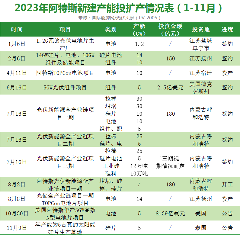 阿特斯2023年1月至今,新簽約項(xiàng)目6個(gè),涉及投資407.8億元;開工項(xiàng)目1個(gè),涉及拉棒30GW、硅片10GW、電池10GW、組件5GW;投產(chǎn)項(xiàng)目2個(gè),新增電池產(chǎn)能24GW。