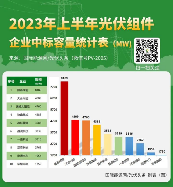 此外,通威一個(gè)重要的布局在于組件領(lǐng)域的迅速擴(kuò)張。從2022年三季度以來,通威在組件領(lǐng)域的動(dòng)作頻頻,迅速擴(kuò)張產(chǎn)能的同時(shí),也在招投標(biāo)市場上頻頻斬獲。據(jù)國際能源網(wǎng)/光伏頭條(PV-2005)統(tǒng)計(jì),僅今年上半年,通威就中標(biāo)47個(gè)項(xiàng)目(標(biāo)段),確定中標(biāo)容量4.76GW,位列企業(yè)中標(biāo)榜第三的位置。