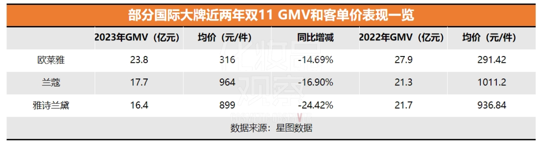 根據(jù)星圖數(shù)據(jù),期內(nèi)(統(tǒng)計時間維度為10月31日20:00-11月11日23:59),歐萊雅、蘭蔻、雅詩蘭黛相比去年均呈現(xiàn)雙位數(shù)下滑,這三大國際品牌同比去年少賣約13億元。