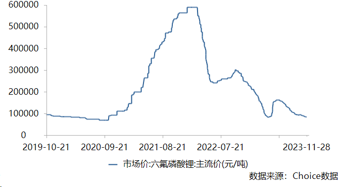 六氟磷酸鋰是鋰離子電池使用的最主要電解質(zhì)鋰鹽,也是多氟多的“第一價(jià)值曲線”,但今年六氟磷酸鋰價(jià)格持續(xù)下行。iChoice數(shù)據(jù)顯示,六氟磷酸鋰價(jià)格于2021年一季度觸及高點(diǎn),隨后震蕩下行。近期六氟磷酸鋰價(jià)格已觸及近幾年的新低。