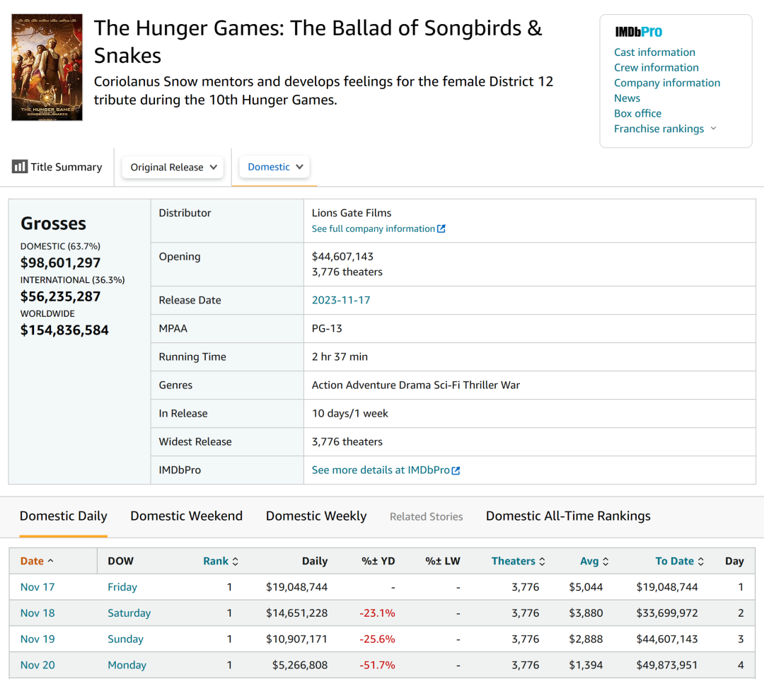 在中國大陸市場,《饑餓游戲:鳴鳥與游蛇之歌》也和許多人預(yù)想中的一樣表現(xiàn)糟糕,雖然同步上映,但上映12天后,累計票房止步在5000萬量級,單日票房位列第十。