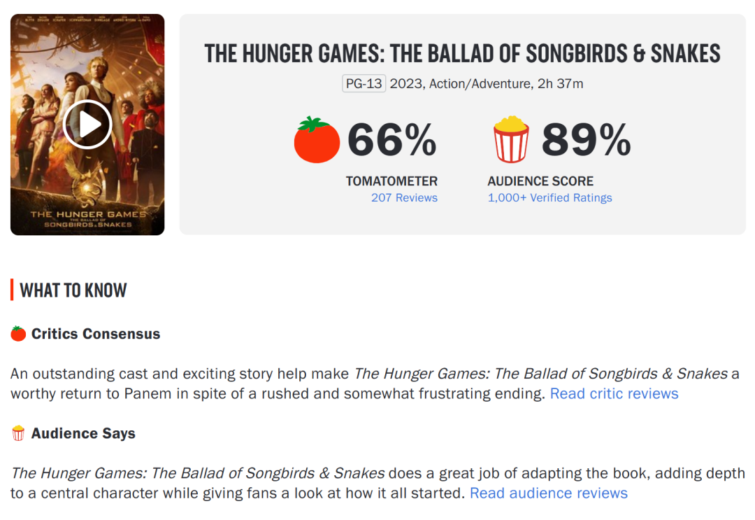 在北美,《饑餓游戲:鳴鳥與游蛇之歌》(以下簡稱《饑餓游戲5》)開畫拿到逾4千萬美元,相較前作出現(xiàn)五成以上的滑坡,也未能博得主流媒體的高分評價。