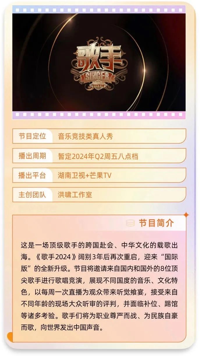 除了《聲生不息》,芒果臺明年最具市場號召力的大音綜項目無疑是《歌手2024》。時隔多年重磅重啟,這個曾助力眾多華語歌手事業(yè)翻紅的大IP依舊抗打,而招商會透露的“國際歌手”“一周一直播”等新鮮看點也令市場頗為興奮。