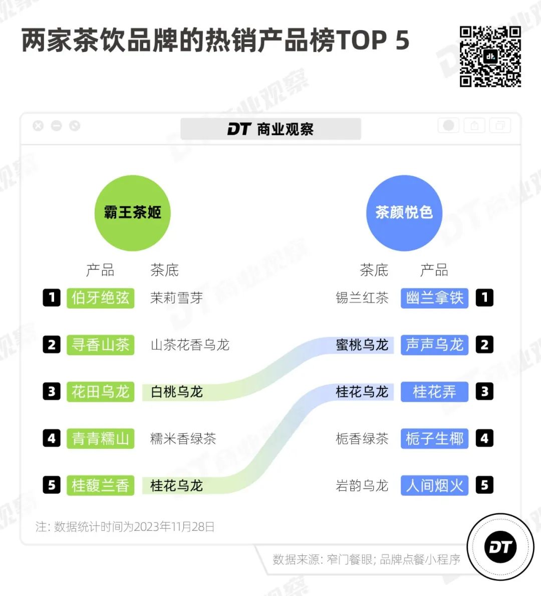 而在主要體現(xiàn)產(chǎn)品差異性的“茶底”搭配上,兩家品牌也有不少相似之處。比如——兩家品牌熱銷前五的產(chǎn)品中,茶底就“撞臉”了兩次。