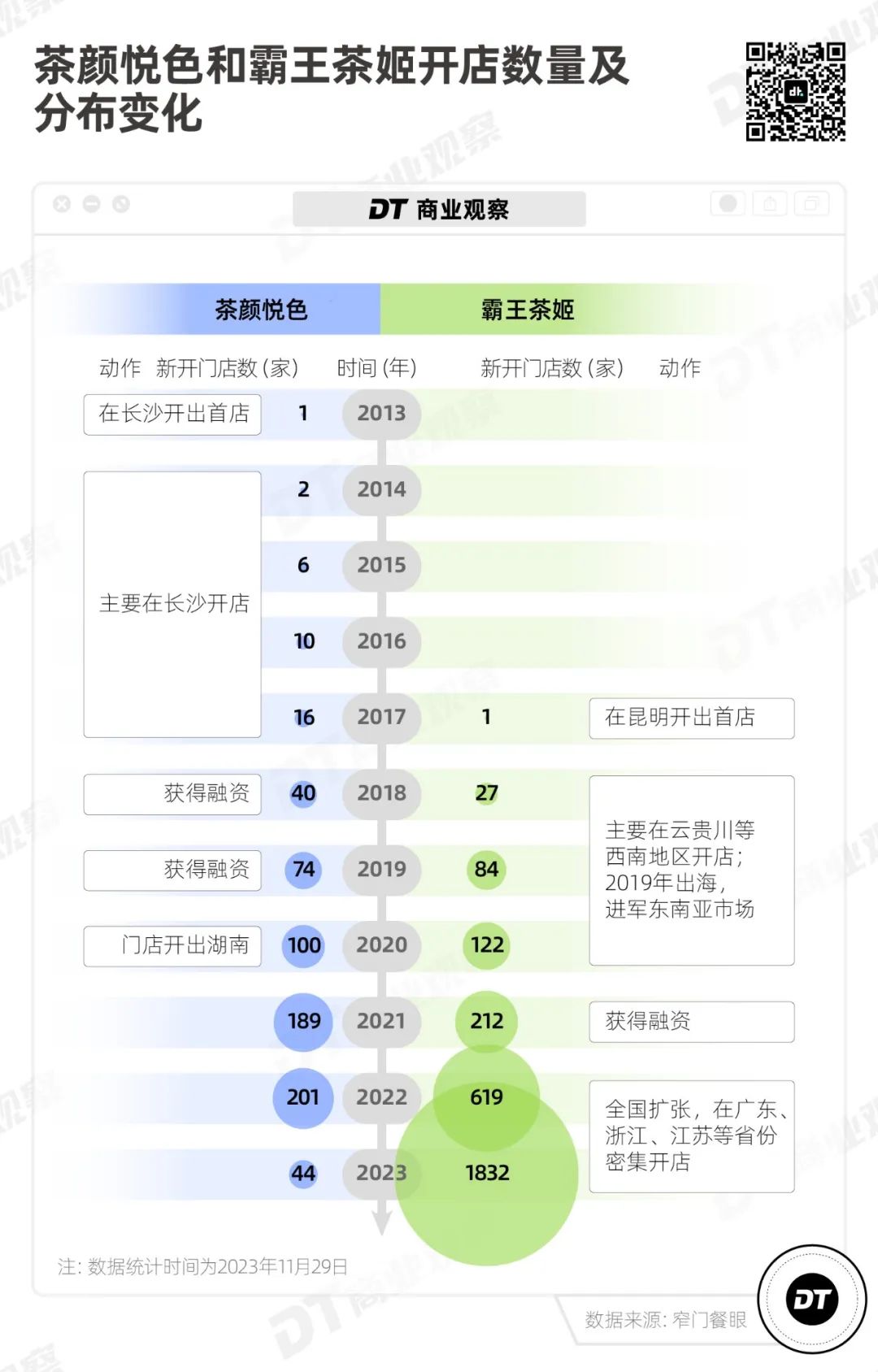 我們整理了茶顏悅色和霸王茶姬歷年的門店變化,發(fā)現(xiàn)一個(gè)明顯的不同點(diǎn)是: