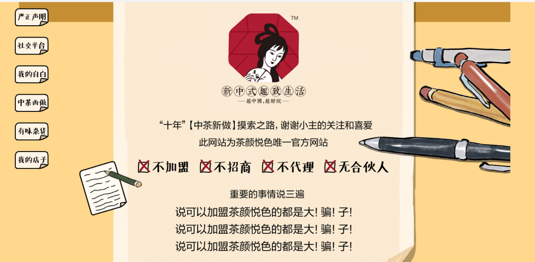 而反觀茶顏悅色,至今仍把標(biāo)注著不開放任何形式加盟的“嚴(yán)正聲明”,放在最醒目的官網(wǎng)首頁上。