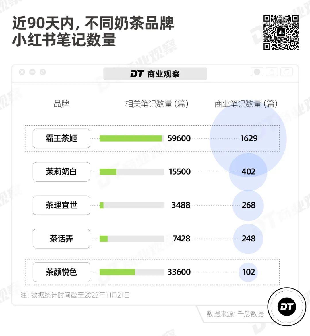數(shù)量對(duì)比更明顯的是商業(yè)筆記(指明確是廣告投放的筆記),霸王茶姬有1600多篇,而茶顏悅色只有102篇。