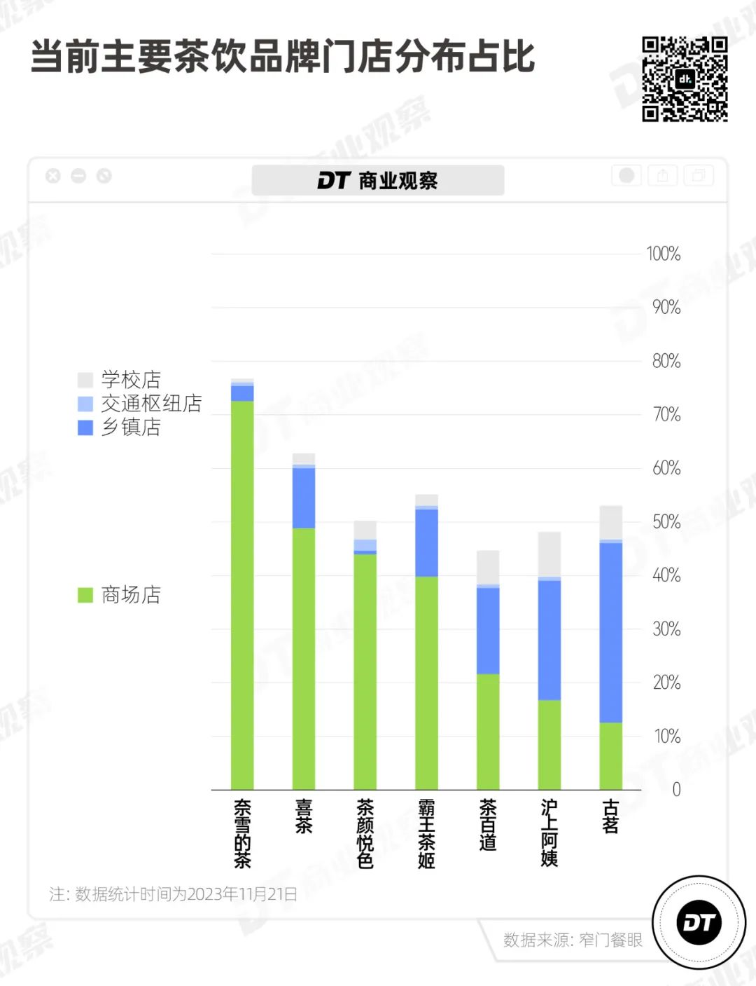 對(duì)比如今主流茶飲品牌的門店分布,當(dāng)前霸王茶姬的商場店占比,僅次于奈雪、喜茶和茶顏悅色。