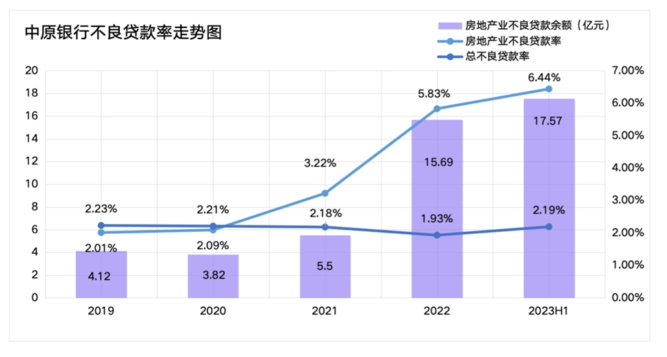 隨著房地產(chǎn)不良率的持續(xù)走高,也助推了中原銀行的綜合不良貸款率位于高位。2022年末,中原銀行的不良貸款率是1.93%,今年6月末不良貸款率進一步飆升至2.19%