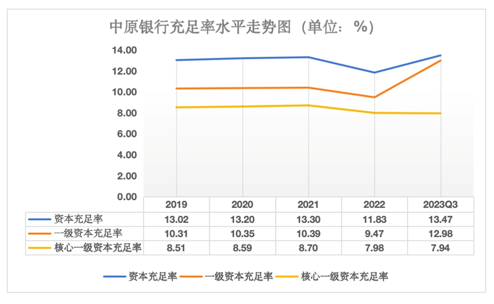 不僅如此,根據(jù)中原銀行最新披露的三季度信息報告顯示,截至9月末,資本充足率為13.47%、一級資本充足率為12.98%、核心一級資本充足率為7.94%,三項指標均遠低于商業(yè)銀行的平均水平。尤其是在核心一級資本充足率上,只比監(jiān)管要求的7.5%數(shù)值高出了0.44個百分點,面臨的資本補充壓力可見一斑。