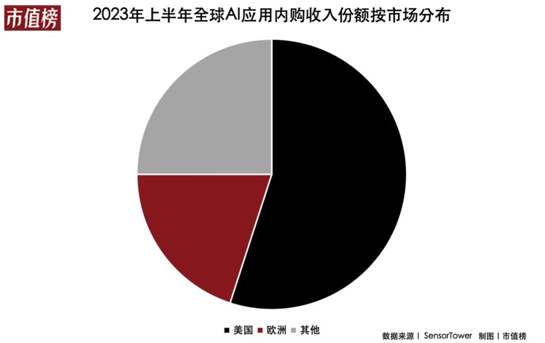 SensorTower數(shù)據(jù)顯示,2023年上半年,移動端(僅包括App Store和Google PLay),美國是AI應(yīng)用內(nèi)購收入最高的市場,歐洲市場的吸金能力也同樣亮眼,他們分別占全球頭部AI應(yīng)用總收入的55%和20%。