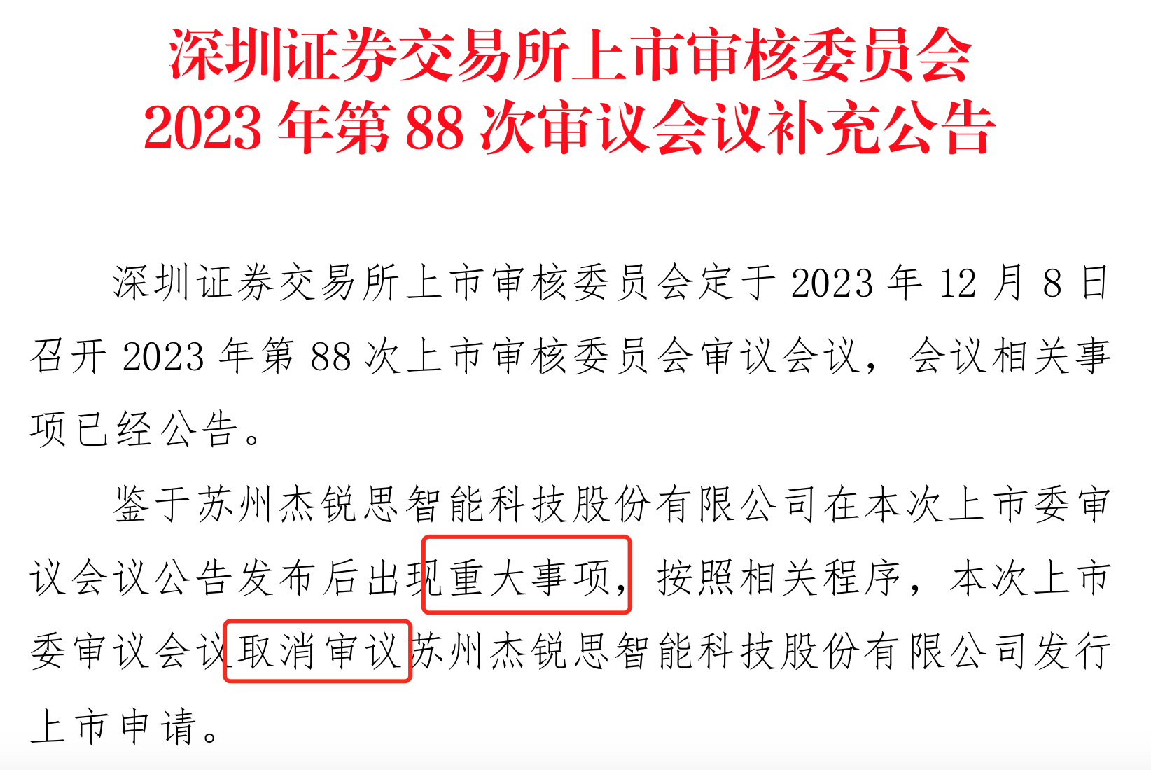深交所方面,上周出現(xiàn)罕見狀況。根據(jù)深交所上市委2023年第88次審議會(huì)議補(bǔ)充公告,鑒于杰銳思在上市委審議會(huì)議公告發(fā)布后出現(xiàn)重大事項(xiàng),按照相關(guān)程序,上市委審議會(huì)議取消審議杰銳思發(fā)行上市申請(qǐng)。至于涉及到了何種重大事項(xiàng),并未有細(xì)節(jié)。公開信息顯示,杰銳思的目的地是創(chuàng)業(yè)板,保薦機(jī)構(gòu)是東吳證券,預(yù)計(jì)融資額6.0364億元。杰銳思是專業(yè)從事智能檢測(cè)設(shè)備和智能生產(chǎn)組裝設(shè)備(線)的研發(fā)、設(shè)計(jì)、生產(chǎn)及銷售的科技型企業(yè)。