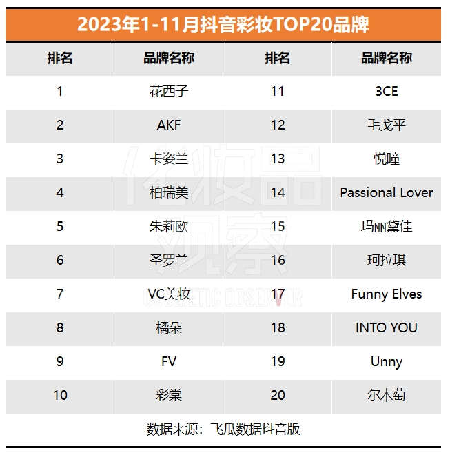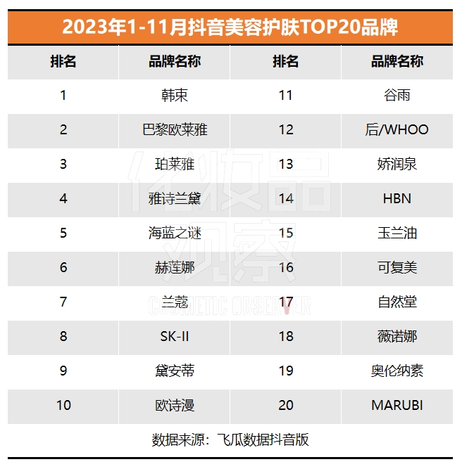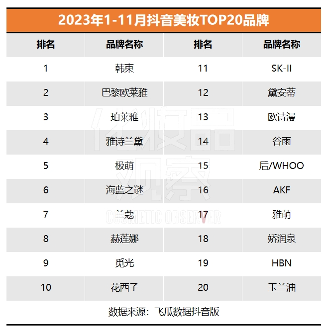 隨著雙11的落幕,抖音美妝今年的競爭格局已基本成型?!痘瘖y品觀察》特此聯(lián)合飛瓜數(shù)據(jù)抖音版,制作抖音美妝1-11月TOP20榜單,以分析美妝市場的競爭態(tài)勢和發(fā)展趨勢。