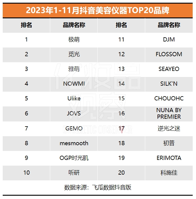 TOP20榜跑進三個美容儀品牌。今年在美容儀市場一直領(lǐng)跑的極萌、覓光、雅萌三大品牌,順利進入抖音美妝TOP20榜,極萌更是跑進前5。